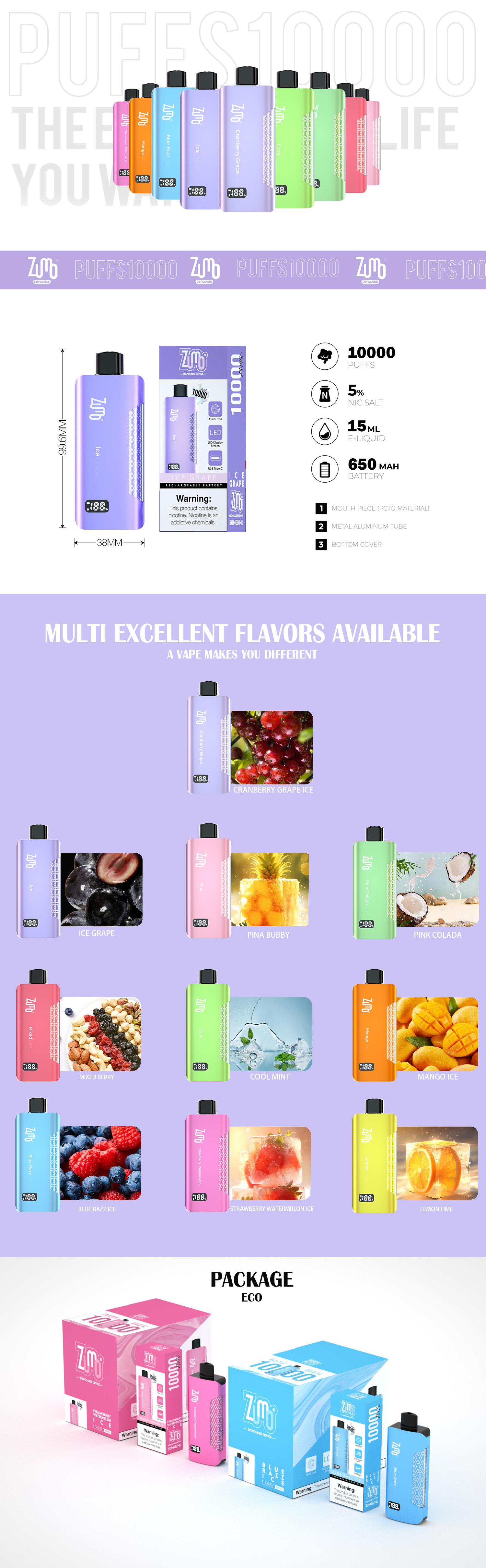 The Zumo Haze is an advanced disposable vape box designed for users seeking convenience, high performance, and a variety of flavors. Below are the key specifications and features: