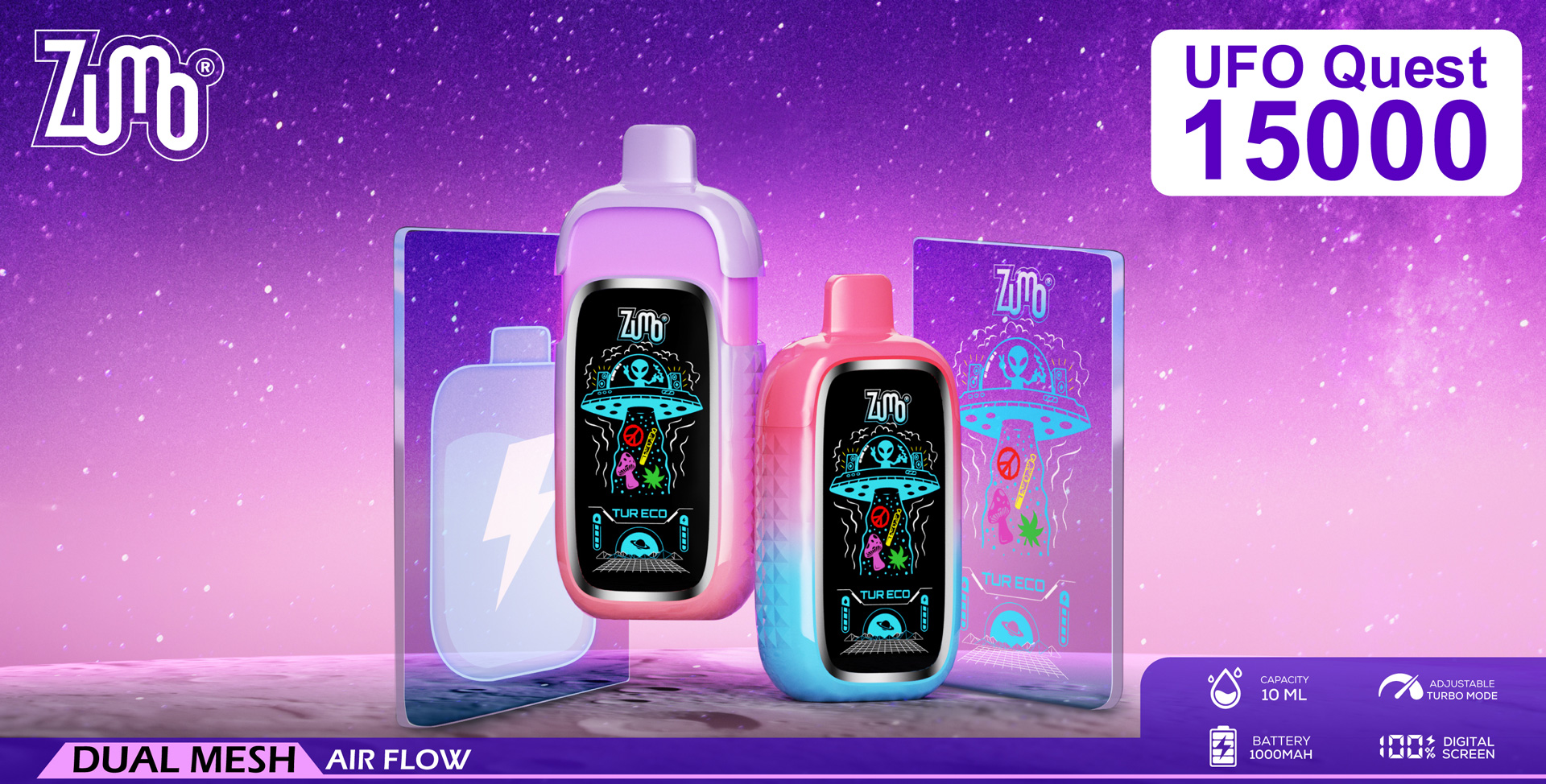 Discover the UFO Quest15000 Smart Vape, designed for power and performance. Featuring a replaceable pod system with a digital screen display, it delivers up to 15,000 puffs in Eco Mode or 10,000 in Turbo Mode. The dual mesh coil ensures bold flavor, while the magnetic pod connection, a 1000mAh rechargeable battery, and Type-C fast charging provide ultimate convenience.